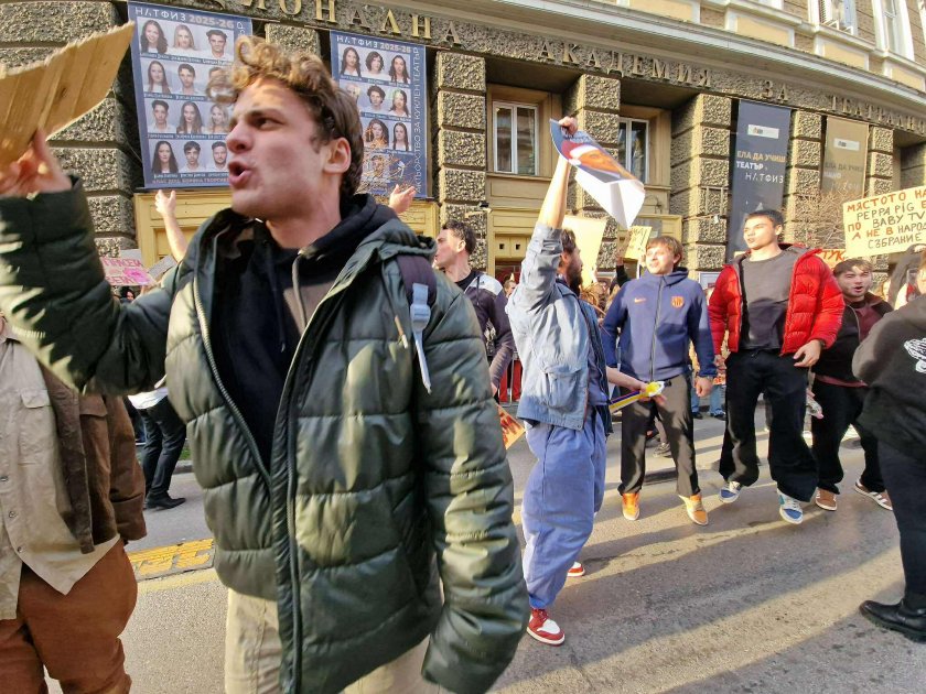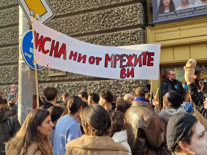 Студенти от НАТФИЗ се събраха пред учебното заведение в знак на протест срещу правителството и блокираха ул. "Раковски".