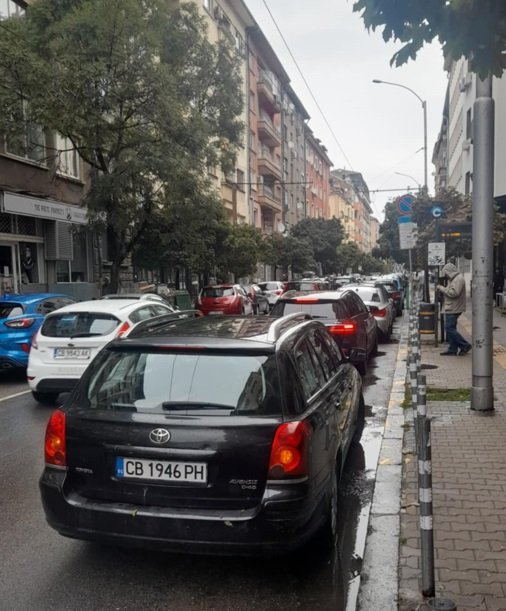 Повечето от колите не са на аварийни светлини и не са спрели за малко, а очевидно са се намърдали на паркинг. Това затруднява движението и на преминаващите автомобили, и най-вече на тролей №9, който е единственият превоз по прочутата софийска улица, но едвам пробива трафика.