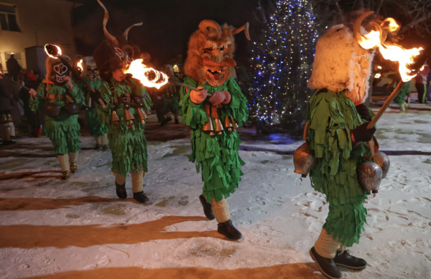 С наричания за спасение от коронавируса маскирани жители на региона възвестяват началото на новата сурвакарска година. Със силен звън на маски, хлопки и огнен танц сурвакарите гонят злите сили.