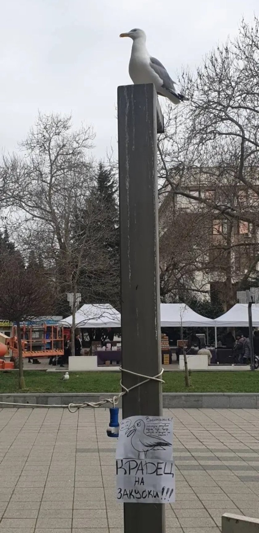 "Внимание, гларуса, редовно сядащ тук, краде закуските от ръцете на хората", гласи предупредителната табела, залепен на стълб в центъра на Бургас. На същия лист има и скица на гларуса като извадена от полицейска хроника. На друг лист пък е написано с големи букви "Крадец на закуски!".