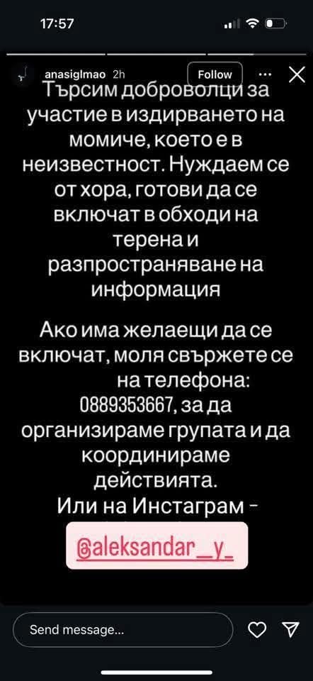“Здравейте, моля, ако някой има информация за това момиче да се свърже с 0884512230 - майка ѝ. Стефани е последно видяна в 17:06 на 6.11.2025 близо до резиденция Бояна да се качва нагоре. Обича планината. Любими места включват хижа и връх “Камен дел”, Копитото, Боянски водопад и други. Възможно е да се движи по маршрут без маркировка и извън очертани пътеки. Облечена е с бяло яке до коляното, кафяв анцунг и сиви туристически обувки. Има черна къса коса и е висока около 1,70. Няма в себе нито лични документи, нито пари, нито телефон, нито челник, за да вижда през нощта. Благодарим предварително за помощта!”