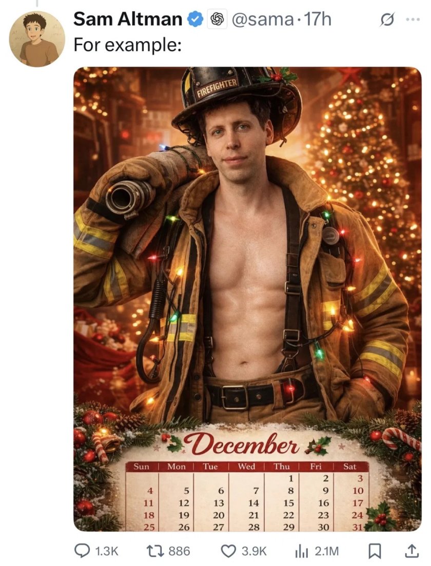 Алтман надписа по-ранен туит, в който се похвали с уменията на ChatGPT за създаване на изображения. Алтман добави образ, който сам си беше създал като изпотен пожарникар с маркуч през рамо, украсяващ страница от декемврийски календар.
