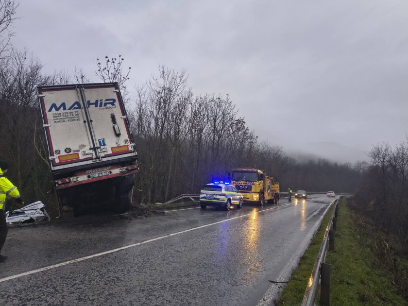 Тирът е все още в канавката и затруднява движението във великотърновска област, където вали дъжд и пътните настилки са мокри.
