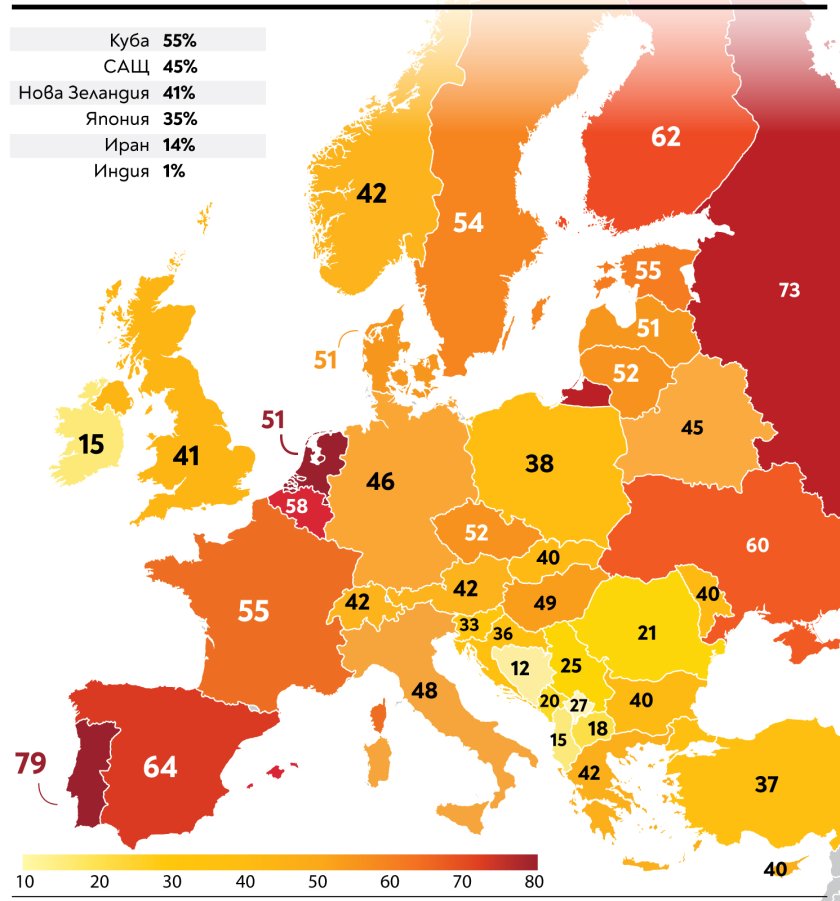 Молдовци и словаци (по 40%), поляци (38%), британци (41%), австрийци и швейцарци (по 42%) гонят същия дял разделени.