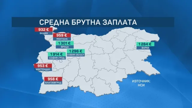 На другия полюс са области като Видин, където средната работна заплата стига едва 932 евро. С по-ниски възнаграждения са и в Кюстендил, Благоевград, Монтана.