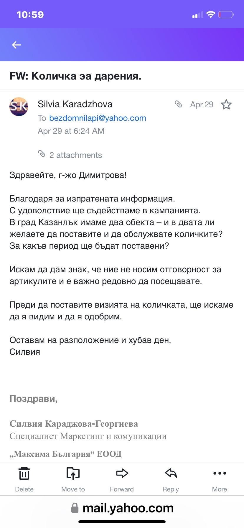 Казанлък. Когато преди няколко месеца решихме да сложим колички в помощ на бездомните животни в Общински приют за безстопанствени кучета - Казанлък във веригата Т - Маркет, ние първо изискахме позволение от Силвия Караджова - специалист маркетинг и комуникация. Няколко месеца всичко вървеше добре, но вчера с изумление научих, че количката в обекта до Била е изпразнена, но не от общинския контрол. Преди броени дни в количката имаше чувал гранули и няколко консерви.