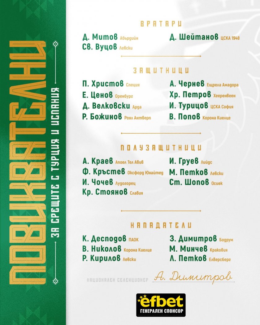 Селекционерът на България Александър Димитров обяви пълния списък с футболисти, на които ще разчита за предстоящите световни квалификации с Турция и Испания.