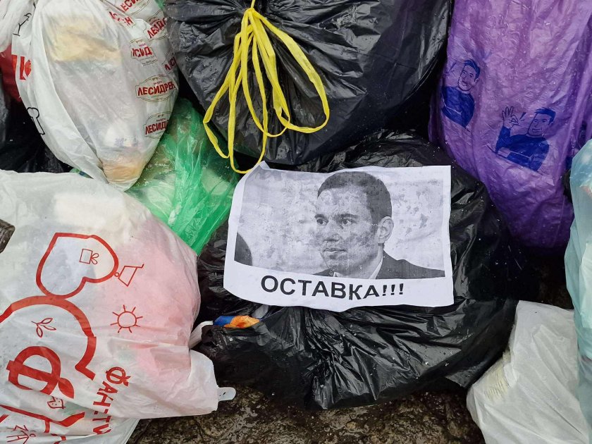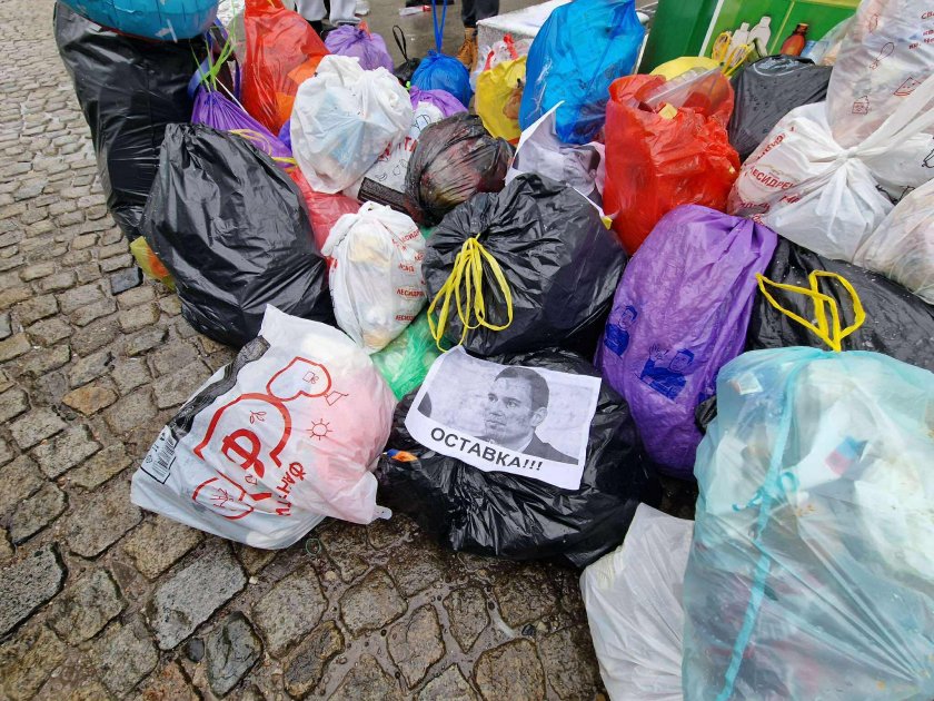 Участниците в демонстрацията поставиха пред сградата чували с боклук със снимки на кмета Васил Терзиев върху тях. Протестиращите скандираха "Оставка".