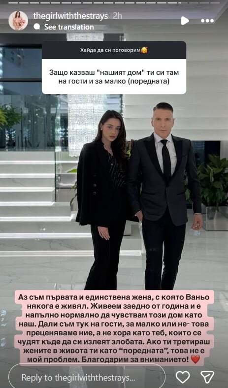 Отговорът й беше категоричен. Валерия заяви, че е първата и единствена жена, с която Ваньо някога е живял, и подчерта, че двамата споделят общ дом вече повече от година. По думите й е напълно естествено да нарича мястото, в което живеят заедно, „наш дом“, а решенията дали е „за малко“ или не се взимат само от тях двамата. Тя не скри раздразнението си от хора, които, според нея, търсят начин да излеят негативизъм и злоба. Валерия допълни, че ако някой има навика да възприема жените в живота си като „поредните“, това е негов личен проблем, а не неин. С позицията си тя ясно даде да се разбере, че няма намерение да се оправдава за избора си или за начина, по който живее и няма да се даде на хейтърите.