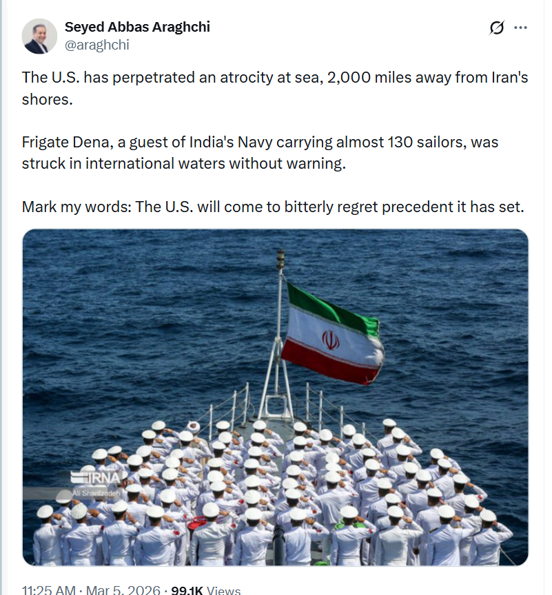 Фрегатата "ИРИС Дена" с почти 130 моряци на борда, гостуваща на индийския военноморски флот, бе поразена от американски удар - в международни води и без предупреждение - написа Арагчи в социалната платформа "Х".