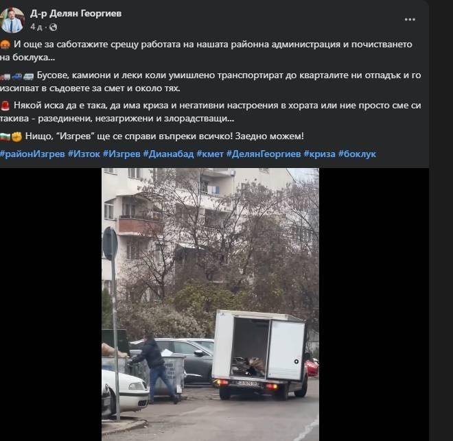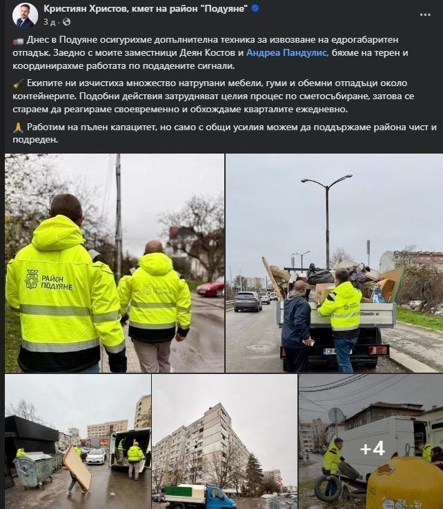"Вместо да се оплакват, Делян Георгиев, Кристиян Христов и Георги Илиев са на терен всеки ден. Ден след ден. Машини, план, организация. Показват как се работи, когато кварталът ти е приоритет, а не извинение.