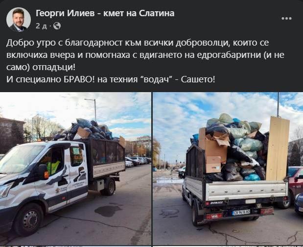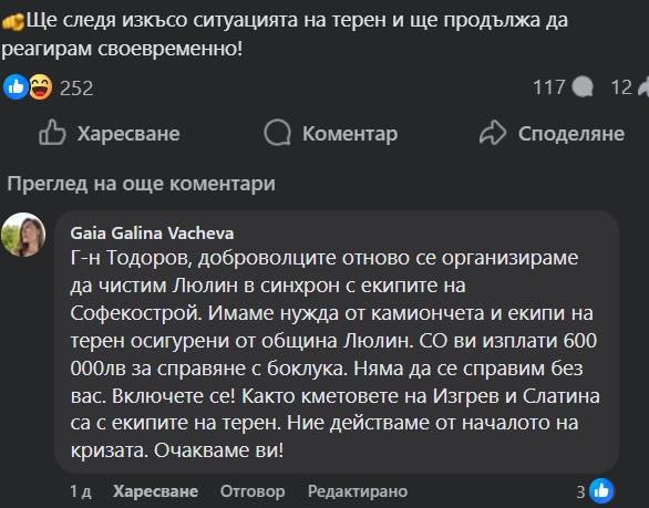 Мобилизираме всички ресурси кварталът да бъде изчистен в кратък срок. И ще го направим с по-малко средства, отколкото са му предоставени на него. Просто защото може – когато имаме воля и характер. Събираме техника, идентифицираме точки, мобилизираме помощ отвън. Огромно благодаря и шапки долу за десетките доброволци в „Люлин“, които за пореден път запретват ръкави и не чакат бурята да мине или да дойде спасител на бял кон. Тази събота отново организират доброволческа акция. Това е акция на хората, които отказват да се примирят, че „тука е така“ или че промяната трябва да си я изстрадат. Инициатива, която аз, екипът ми и служителите на „Софекострой“ ще подкрепим с техника, с хора и с още повече енергия. Подкрепете я и вие (линк в коментар)", написа бесен Терзиев.