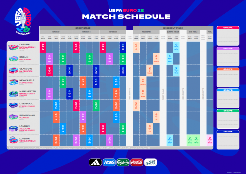 Мачове ще се проведат в девет стадиона в няколко основни града – Лондон (Уембли и Тотнъм), Манчестър, Дъблин, Глазгоу, Кардиф, Белфаст, Нюкасъл, Ливърпул, Бирмингам и други.
