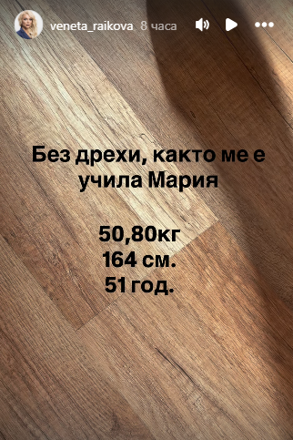 „Без дрехи, както ме е учила Мария“, написа тя, добавяйки конкретни цифри – 50,80 килограма, 164 сантиметра ръст и 51 години.