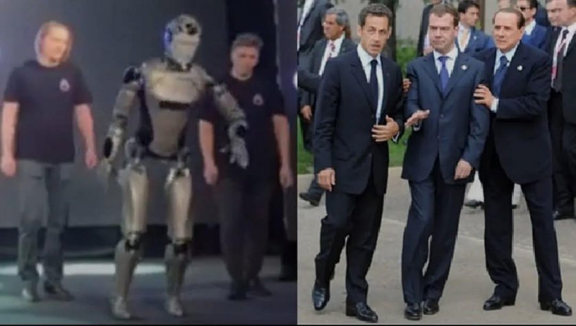 Паметливи пък веднага направиха паралел с историята и се сетиха кой е прототипът на нещастната машина - алкохолизираната свиня Дмитрий Медведев. И припомниха с кадри как дребосъкът, тогава президент на Русия, беше поддържан от Никола Саркози и Силвио Берлускони на среща на Г-7 (тогава Г-8).