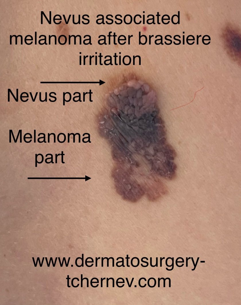"Интересен аналогичен и относително стар случай на отново пациентка с вече развил се кожен меланом вследствие на иритация на бенка от сутиена.