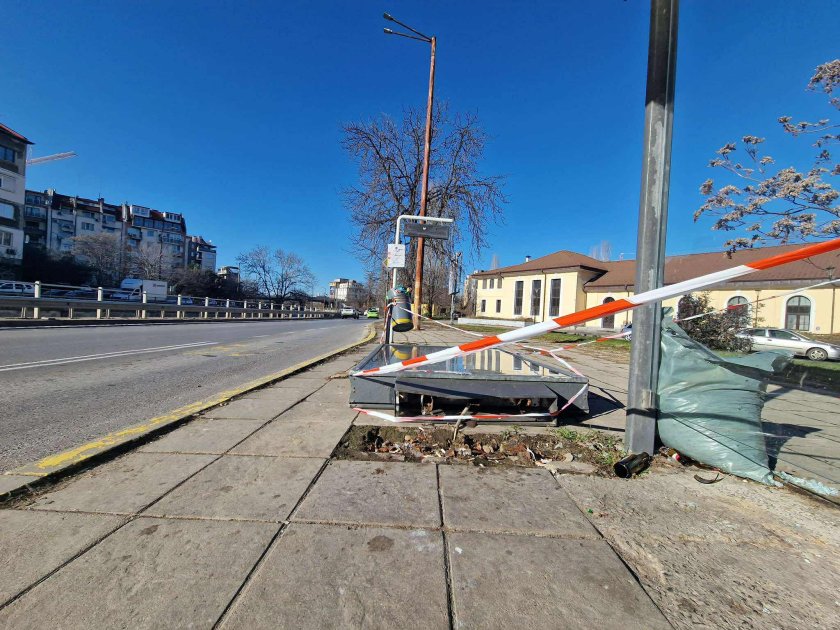Обектът е формално заграден със сигнална лента, но реално не е обезопасен – повредените елементи лежат на тротоара, има оголени части и тече ток.