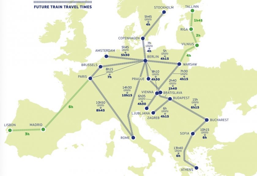 Европейската комисия представи днес мащабно предложение за изграждане на високоскоростни железопътни линии в Европейския съюз до 2040 г., сред които е и трасето София-Атина. По проекта се предвижда времето за пътуване между двете столици да бъде намалено от 13 часа и 40 минути на само 6 часа, предава БТА.