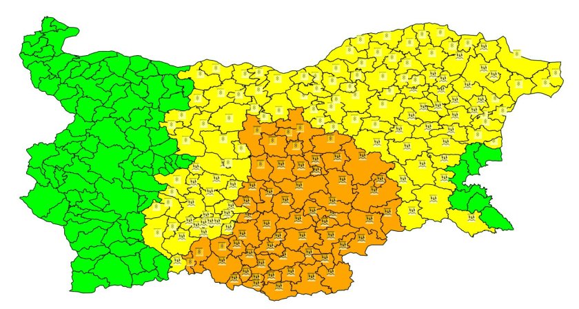 За 21 февруари, събота, Националният институт по метеорология и хидрология (НИМХ) издаде още от днес предупреждение от първа степен - жълт код, за поледици и значителни валежи от дъжд и сняг за 11 области. Предупреждение от втора степен - оранжев код, е обявен за девет области в страната, се съобщава в картата с предупредителните кодове за опасните метеорологични явления, публикувана в сайта на НИМХ.
