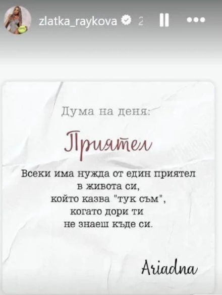 След близо едноседмично мълчание, Златка Райкова си позволи, макар и завоалирано, да отвори темата за ситуацията с мъжа й. Плеймейтката публикува откъс от новото парче на Камелия в дует с Мартин Светломиров, в което се пее:
